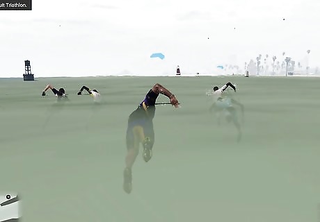 Start the triathlon. Once you approach the triathlon (which can be spotted by its large inflatable gate), an onscreen prompt will ask if you want to participate or not. Select yes to begin. After you have selected yes, the screen will grow dark, and reopen to a group of racers on the shore of the beach, including your character. A countdown will then commence.