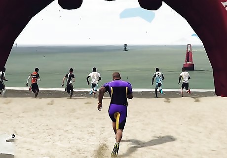Head for the water from the beach. The first section of the triathlon is the swimming portion. The racers will begin on the shore of the beach. Once the triathlon begins, repeatedly tap the X button (PS3), A button (Xbox 360), or Shift key (PC) to sprint into the water.