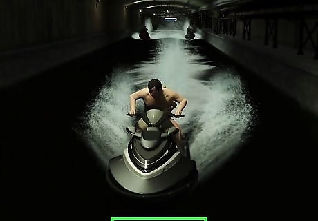 Escape from your pursuers after the cutscene. You'll have to flee from your pursuers on the Jet Ski. Michael will automatically board the vehicle, followed by Tracey. Take a left and turn into the outlet to go underground. Your attackers will begin shooting at you; you can retaliate or keep going. Take a right, and you'll be out in the light again. Keep going straight until you come to the docks, then take a right again, heading towards the sailboat.