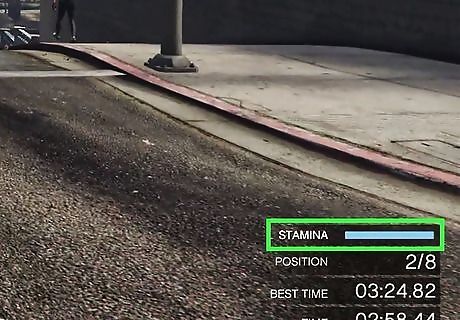 Keep a watch on the stamina bar. As this is the last leg of the race, be careful with your character's stamina. Their stamina bar is the blue bar next to their health, and decreases with excessive physical strain. If this bar runs out, your character will begin to take damage. It is best to monitor stamina usage in the first two events, saving all of your character's energy for the last sprint.
