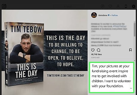 Follow Tim Tebow’s Instagram to comment on pictures or message him. Search for “Tim Tebow” or look up @TimTebow on Instagram to look at Tebow’s profile. To follow, comment, or message him, you must have an Instagram account. Write him a message, and send it through the direct message feature. You can also leave a comment on any of his pictures. You can also view his Instagram page here: https://www.instagram.com/timtebow/?hl=en When commenting on his pictures, tag @TimTebow so he receives a notification when you send the comment. He is more likely to see your comment if you tag him. Tim doesn't seem to send many personal comments back on Instagram, so sending a direct message is a better option! For example, you can comment something like, “Keep up the great work!” or write a message like, “Tim, your pictures at your fundraising event inspire me to get involved with children. I want to volunteer with your foundation.”