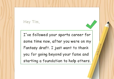 Write a letter or fan mail to the Tim Tebow Foundation. Start your letter off by writing “Dear Tim Tebow” or “Hey Tim!” Detail your letter with your your thoughts, feelings, and appreciation for Tebow, and sign the letter by writing “Sincerely,” or “Thank you,” followed by your name. You can type the letter on your computer and print it out. For a personal touch, consider handwriting your letter. You can write something like, "Hey Tim, I've followed your sports career for some time now, after you were on my Fantasy draft. I just want to thank you for going beyond your fame and starting a foundation to help others."