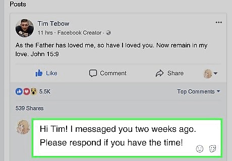 Send a follow up message at least 2 weeks after your first message. Wait patiently for Tebow to message you back. You want to avoid sending him multiple messages in a short period of time. He is not likely to respond if you do so. In your message, you can request a follow- up message, then wait at least 2 weeks before you send a follow-up message yourself. Tebow likely receives many messages a day, in addition to his busy life. It may take some time before he is able to respond to you.