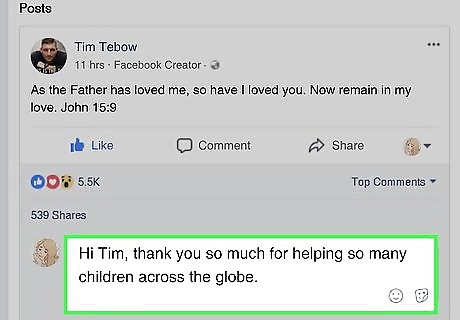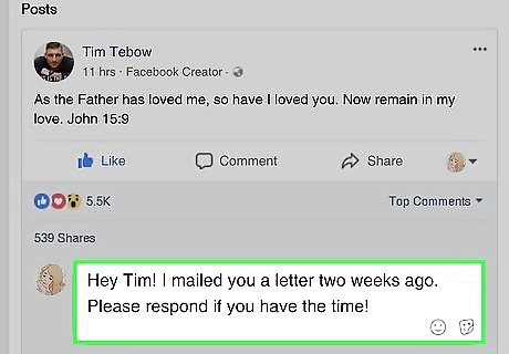 Send a message or comment on Tim Tebow’s Facebook. You can visit his page and send him a message. Tebow keeps an active Facebook page so there is a chance he will contact you back. In addition to messaging him, you can also comment on posts Tim Tebow puts on his Facebook page in hopes of him commenting back. To find his page, search for “Tim Tebow” on Facebook. You can also access his Facebook page here: https://www.facebook.com/TimTebow/. For example, you may draft a message like, “Hi Tim, thank you so much for helping so many children across the globe.” or “Tim, you inspire me to give back to charity.” Write as long of a message as you’d like on Facebook. There is no character limit for either direct messages or comments.