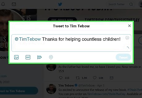 Tweet and tag Tim Tebow on Twitter. You can tweet Tebow directly through his Twitter handle @TimTebow, though you must have a Twitter account to correspond through Twitter. Write him a message in 140 or less characters, and tag him in the tweet so he will be notified when you send your message. He is the most active on Twitter, so this may be your best contact method. You can also access his Twitter page here: https://twitter.com/timtebow?lang=en. Write something like, “@TimTebow Thanks for helping countless children!” or “@TimTebow You are my favorite sports player this season.” Tim Tebow can respond to your tweets by tagging you and posting a message.