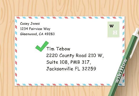 Address your envelope to the Tim Tebow Foundation. The only way to contact Tim Tebow through the mail is to send your letter to the Tim Tebow Foundation. Attach the correct postage to your envelope, and address it to “Tim Tebow” at 2220 County Road 210 W, Suite 108, PMB 317, Jacksonville FL 32259. List your name and address in the top right corner to include a return address.