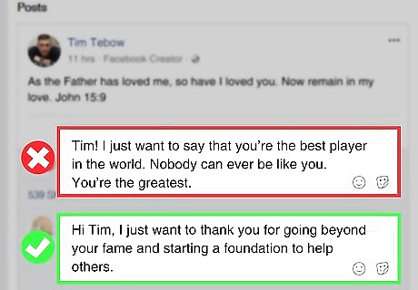 Be friendly and authentic when you message Tebow to get his attention. Tim Tebow is values faith and kindness, so if you display that in your messages, he is more likely to connect with you. Be yourself!