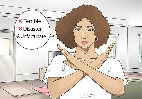 Remove overly negative words from your vocabulary. Extreme terms like "terrible" and "disaster" shouldn't apply to minor annoyances and inconveniences. Toning down your language can help you put negative experiences into a healthier perspective. Replace these words with encouraging thoughts or praise. When you do catch yourself using one of those words, immediately replace it in your thoughts with a less extreme term. "Terrible" can become "unfortunate" or "not as good as I had hoped." "Disaster" can become "inconvenience" or "challenge."