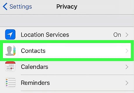 Select a category. Each option (Contacts, Photos, Camera, etc.) displays a list of apps that have requested permission to access it. Each app in the list has its own on/off switch. If the switch is green, the app can access that option. For example, if you select Contacts and see a green/on switch next to PayPal, then PayPal can access your contacts. If you select Contacts and see a gray/off switch next to Messenger, then Messenger cannot access your contacts.