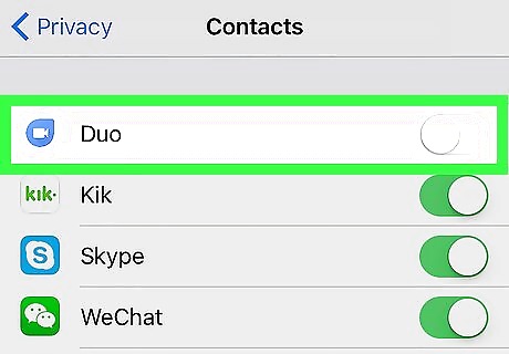 Use the switches to adjust your settings. Slide an app's switch to the "Off" position to deny access. When the switch turns gray, the app can no longer use that information. Slide an app's switch to the "On" (green) position to grant it access to that category.