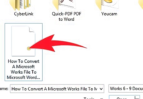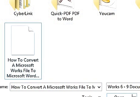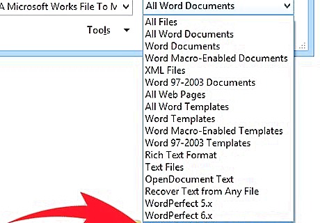 Click the drop-down arrow of the tab known as "Files of type" (as in the 2003 version of Word). You'll need to locate where it says Microsoft Works (or something real close to that).