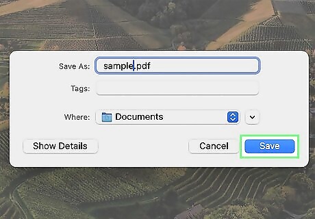 Click Save. It's in the lower left-hand corner and will save the document as a PDF. Only some apps have the "Export" feature, so you might be wondering how you can save something without it. The answer is to use the "Print" function to save it as a PDF.