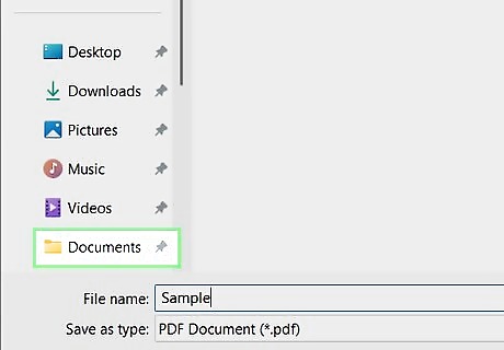 Select a save location. On the left side of the window, click the folder in which you want to store your PDF. For example, if you want to save your PDF on the desktop, you'd find and click Desktop in the left-hand sidebar.