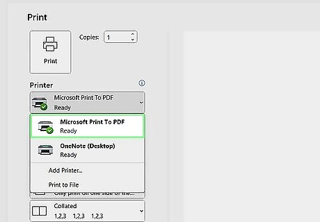 Click Microsoft Print to PDF. It's in the drop-down menu. Doing so selects your computer's "Print to PDF" feature as the method with which you'll "print" your document. If you're using a text document or an XPS document, you'll just click Microsoft Print to PDF in the "Select Printer" section near the top of the window.