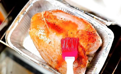 Baste the turkey crown with half of the glaze and roast it for 1 hour. Remove the turkey crown from the oven and use a pastry brush or spoon to coat the crown with half of the glaze. Return the uncovered roasting pan to the oven and cook the turkey crown for 1 more hour. Baste the turkey crown 1 to 2 more times while it bakes. The glaze will caramelize as it cooks so it may be sticky.