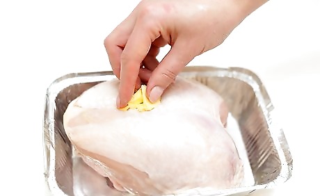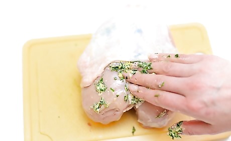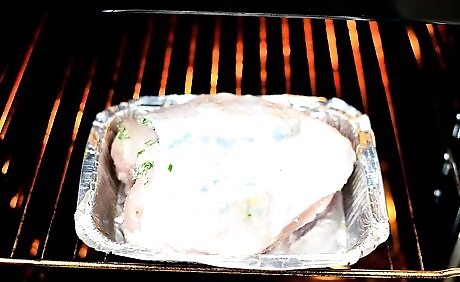 Rub the herb butter under the skin of the turkey crown. Get out a 4 to 5 pound (1.8 to 2.2 kg) turkey crown and use your fingers to pull up the skin of the turkey away from the flesh. Scoop the herb butter underneath the skin and rub it evenly between the skin and the flesh. Set the turkey crown in a roasting pan so the skin side is facing up.