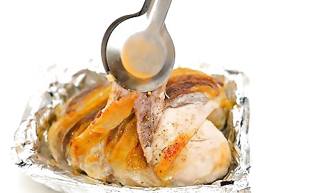 Remove the bacon and baste the turkey crown. Remove the roasting tray from the oven and use tongs to take the bacon off of the turkey crown. Put the bacon on a serving plate and cover it with aluminum foil. Use a pastry brush or turkey baster to baste the turkey crown with some of the cooking juices.