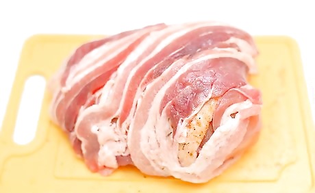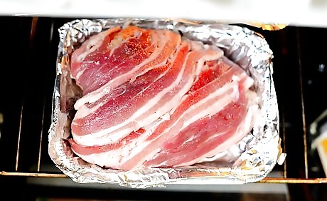 Lay the bacon over the top of the turkey crown. Get out 10 strips of bacon and lay each strip over the top of the turkey crown so the turkey is completely covered. The bacon will keep the turkey from drying out and will become crisp as it bakes.