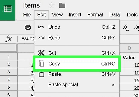 Click Copy from the edit menu. You can also right-click a cell and select Copy.