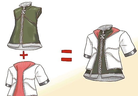Match your clothing items by twos. Roxas wears things in twos. The first part of his jacket/shirt combo is a black zipper-up sweatshirt. The zipper piece is a complex shape that resembles four arrows or even a shuriken. Look for a sweatshirt with a gray ribbed cuff at the bottom by the waist. The second part is a white short sleeved sweatshirt with a zipper, and various black patterns on it. The sleeves have a black cuff. Near the chest are blocky patterns that match front-to-back. A little bit of the collar sticks out, kind of like if you were to pop the collar and have the two parts stick out.