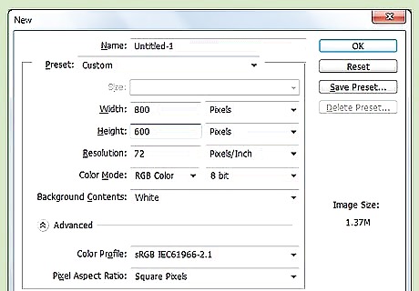 Start by opening your graphics program. Create a 'New Document' with a size of 800 pixels wide by 600 pixels tall.