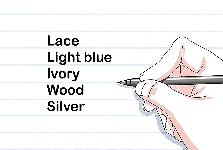 Write down some keywords. Start with five words that describe your idea or concept. For example, if you want an antique-themed wedding, your words might be: lace, light blue, ivory, wood, silver.