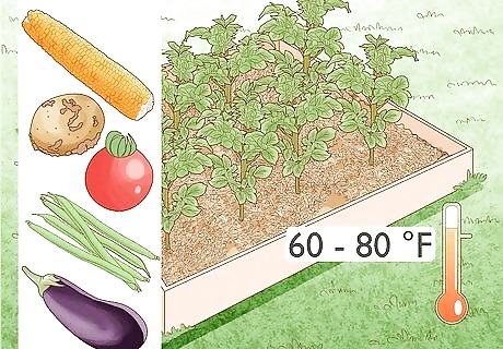 Pick vegetables like corn in warm to hot weather. Along with corn, potatoes, tomatoes, eggplants, and beans grow well in temperatures between 60 to 80 °F (16 to 27 °C). These plants should not be exposed to frost. So make sure the majority of growing time is during warm weather for any of these vegetables. Capsicum and all vine crops also grow well in warm weather.