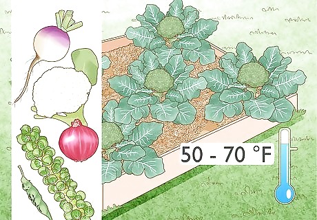 Grow plants like broccoli during cool weather. Consider your climate and the time of year you’re creating your garden when choosing what vegetables to plant. If you live in a cooler climate or if it will be fairly cool during the growing season, like 50 to 70 °F (10 to 21 °C), then considering plants such as broccoli. Along with broccoli, Brussels sprouts, cauliflower, turnips, onions, and peas are ideal for cooler temperatures because they can withstand a light frost.