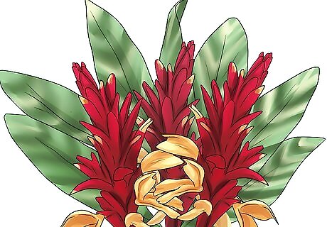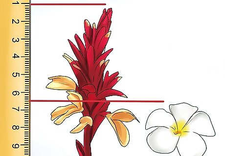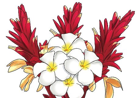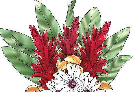 Determine what size flowers you want. Are you going for a big, statement bouquet or something with smaller buds? Big is better for a large, loose bouquet, while smaller flowers look best in a gathered bouquet. The African tulip, cautleya, catasetum, bottle brush, and decorative dalia flowers are all larger tropical flowers. Smaller tropical flowers include chrysanthemums, constantia, and frangipani.