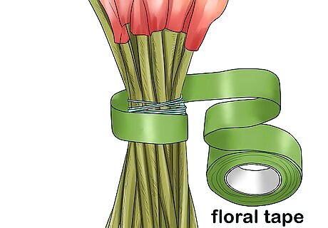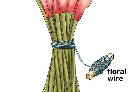 Bind the flowers with floral wire. Once you have the flowers arranged how you want them, twist floral wire around the stems to hold them in place. This will prevent your bouquet from falling apart and also make it easier to hold.