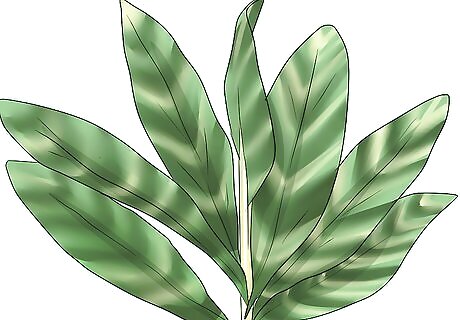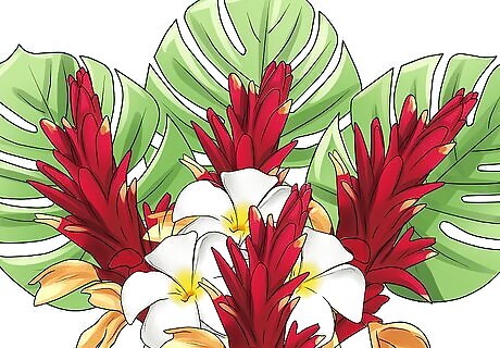 Start with a base of greenery. Starting with tropical grasses or leaves gives you a base for the rest of your flowers. Big tropical leaves like ginger foliage or virions are a great option for this. Keep in mind that your bouquet will need to match the size of your greenery, so if you’re aiming for a small bouquet, use less greenery, or smaller leaves.