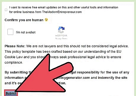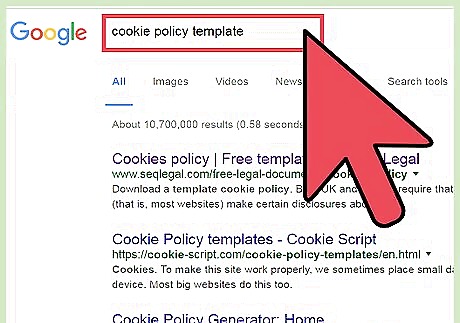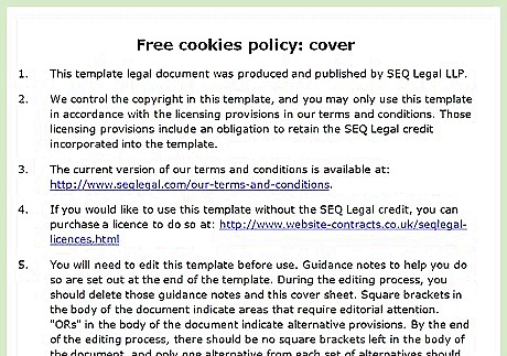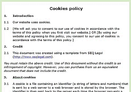 Try using a cookie policy template or generator. Model your cookie policy off of one from another website, or a template or generator designed for this purpose. Just make sure you include accurate information specific to your website. Note that many websites that provide templates or generators are not provided by lawyers and you should not assume that the generated policy assures your compliance with any laws in your country. Consult with a lawyer regarding your policy and any applicable browser cookie laws. Use a template by simply filling in the specific details of your website and cookie usage in a document that has the rest of the text already generated. Make sure you provide proper attribution to the template's author if they require you to do so.