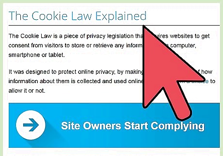 Implement a banner or pop-up for consent. Make consent for cookie usage be an easy and obvious action step when new users visit your website. Include a short amount of text about why you use cookies, a link to a longer cookie policy, and something for users to click to acknowledge their consent. Try a banner that appears at the top of the website for new users, which is the most common way to allow users to be informed and give consent for cookie usage. Ironically, you will want to use persistent cookies on your website to ensure that once a user has given consent, the banner won't continue to show up every time they view the site. Some website's design templates, like WordPress, may offer a widget or provided code to add to your website to make cookie consent and compliance with the law easier.