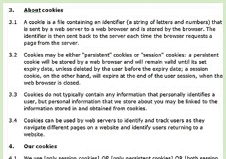 Keep your policy short and readable. Make your cookie policy as brief as possible while still providing a comprehensive explanation. Try to keep your policy down to one page, sticking to the basic facts regarding your use of cookies. Unlike other documents that may exist on your site strictly for legal purposes, and may consist of several pages of jargon, a cookie policy most importantly informs and assures the public. Because of this, you want to keep the policy as readable and approachable as possible. Avoid using complicated web developer terms or vague reasoning when describing how you use cookies. Stick to the concrete benefits or processes in layman's terms when you write your policy.