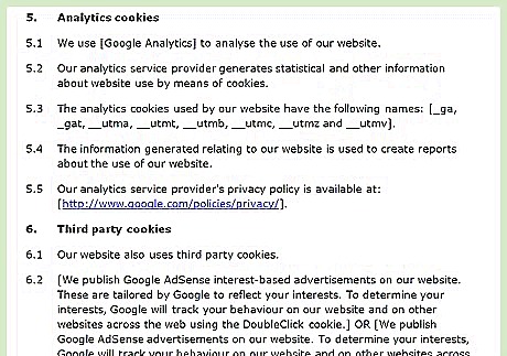 Learn what cookies your website uses. Make sure you know exactly what types of cookies your website uses and what they are used for. This is essential to truthfully and accurately explain cookies in your policy, as every website is different. Consult with your web developer about the type of cookies used by your site and what they are for, as they will be most familiar with and specific about the site's functions. Communicate with or read the cookie policies of other third party services which may collect cookies on your site. This could include any service you use for search engine optimization, conversion optimization, other web analytics, or advertisers.