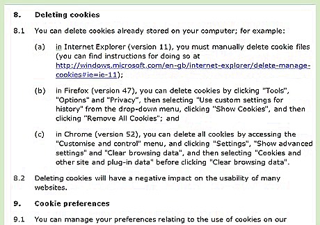 Describe how a user can delete or control them. Provide instructions to the best of your ability for users who wish to disable or block cookies that your website requests from them. Be sure to explain that doing so may prevent regular use or access to certain features on the site. Explain that any user can go to the “Settings” in his or her browser to find control features to accept or reject some or all cookies requested from websites. This is also where a user can delete cookies already stored in the browser's memory. In your policy, link to a page with further instructions specific to each type of browser. You can also encourage cautious users to update their internet browser, install anti-spyware software, and access websites from a secure internet network in order to be more protected from security threats and those that attempt to use cookies for malicious intent.