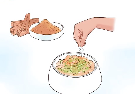 Put a pinch of cinnamon into their dog food. Cinnamon, like coconut oil, has many presumed health benefits attached to it. In this case, though, it’s mostly being used as a masking agent to cover up bad breath. Don’t add more than a pinch of cinnamon to your dog’s food at each mealtime, or the flavor and scent may be too intense for their liking.