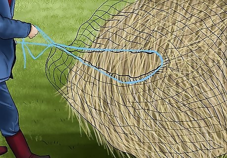 Cut the strings or net wrap. Using a sharp utility knife, make a cut perpendicular to the flat areas of the bale that stretches from one end to the other at a height that is around chest-height to you or lower. The way some balers wrap it is easier to cut on the side it needs to unroll. If unrolling make sure stems are pointing toward the way it needs to be unrolled. it will unroll just like a carpet if turned the right way. You may have to make several cuts if the knife is dull or if the strings are buried deep in the bale. Double and triple-check that you've cut all the twine or netting that is attached to the bale. With some bales, the string may be embedded a few inches (centimetres) into the bale, which may make it impossible to cut. You will need to use your fingers to find the string before making the necessary cuts.