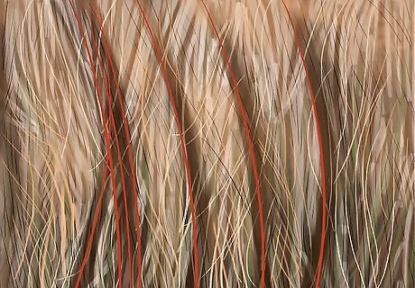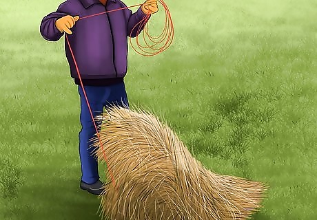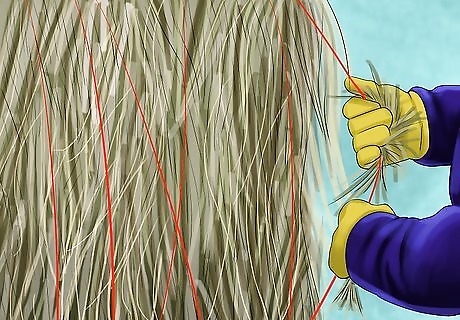 Pull the string or net wrap from the bale. Beware of any thorns or sharp objects when grabbing the string. Once you've got all the strands in your one hand, pull out the strings from the bale, using your body weight and strength in your arms and legs, to free difficult strands. You can just pull the string as is, or form a simple knot to bind the string together and use the loop you formed from the knot as a means to help better pull the string off the bale on one fell-swoop. If you are taking off netting, you can apply the same procedure as above. You'll find though, that older net wrap tends to tear easily than baler string does, which will make it a little more challenging to gather and pull off the bale. During the wintertime (especially if you are in an area where you get snow and ice) you may find it a bit more difficult to pull twine or net wrap off of the bale. Ice formed on top of the bale tends to hold the string or net wrap a bit more fast than if you were doing this in the spring or fall when there is no ice or snow to be had. You just need to use a bit more muscle force to remove the string, or if it's particularly stubborn, the knife to help free it. If needed you can wrap twine around a stick and pull on the stick with more force to free the twine up.