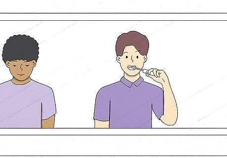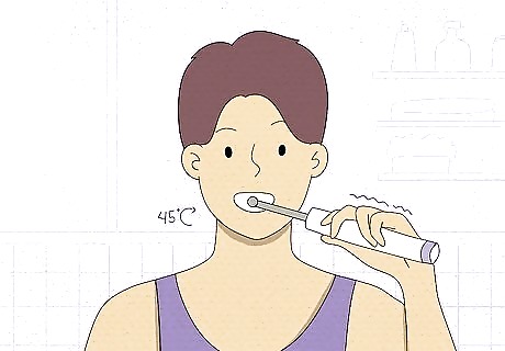 Learn to brush your teeth carefully. Brushing your teeth changes when you have braces. After getting your braces put on, learn to brush your teeth carefully. Talk to your orthodontist about how to best brush your teeth and follow their instructions carefully. With braces, you brush each tooth carefully from the top to the bottom. Shift the brush at a 45-degree angle to get both the tops and the bottoms of your teeth while brushing. Then, use your brush to brush the bottom and inside surfaces of your teeth. You should also brush 3 times a day. Make sure to clean all of your teeth. Do not forget to brush the area below the braces. This area is frequently neglected. A dentist may request that you use a special brush, called an interproximal brush, to clean between your braces. If a dentist gives you a brush like this, talk to them about how to best use it.
