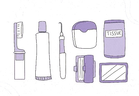 Make a braces kit. A braces kit can be a handy tool to carry with you throughout the day. You can bring the kit with you to places like school or work. If anything happens with your braces while you're out, you will have the supplies you need. In a small toiletries bag, store the following: A mini toothbrush Toothpaste Dental floss Dental picks A small mirror A pack of tissues Some wax for your teeth