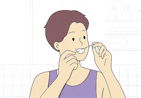Floss with braces. Flossing with braces can be a challenge. To start, gently feed the short end of the floss through the uppermost portion of your teeth, near your gums and the main arch of your braces. Saw back and forth to work the floss between your two teeth. Then, repeat between all the other gaps between your teeth. Be very gentle when flossing with braces. Do not press against the wire arch of your braces when flossing.