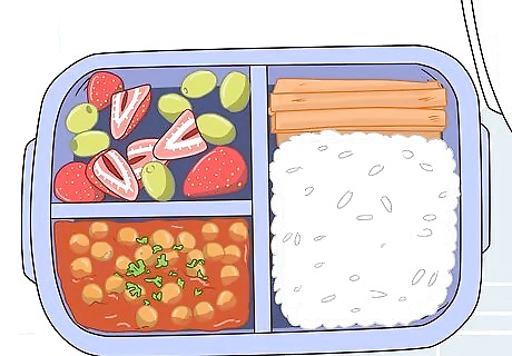 Have more plant-based foods for lunch. Plant-based foods contain plant estrogens, which can help to lessen the number of hot flashes you experience and the severity of your hot flashes. Try adding plant-based foods like soybeans, chickpeas, lentils, flaxseed, beans, and grains to your lunches for work. You can also have more fresh fruits and vegetables as part of your daily lunch at work. Try to pack your own lunches so you can control what you eat. If you do eat out, look for meals that contain a lot of plant-based foods. Eat more cruciferous vegetables, such as cauliflower, broccoli, and cabbage since they have indole-3-carbinol, which can help balance declining estrogen.