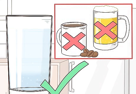 Drink water instead of alcohol or coffee. Alcohol and coffee can dehydrate you and make you sweat, making your hot flashes even worse. Rather than have a cup of coffee in the morning at work, go for a glass of cold water or room temperature herbal tea. You should also avoid or limit alcoholic beverages as much as possible, opting for non-alcoholic drinks most of the time instead. However, you can still have a drink now and then. Get in the habit of bringing a big glass of water with you to meetings at work. You may also carry a water bottle with you or keep one at your desk so you have access to cold water at all times. Aim to have at least 8 glasses of water a day to stay cool and hydrated.