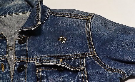 Take the first stud and press the prongs through the jacket. Go from the outside of the jacket to the inside with the prongs so the face of the stud is exposed. The sharp metal prongs should easily push through the denim.