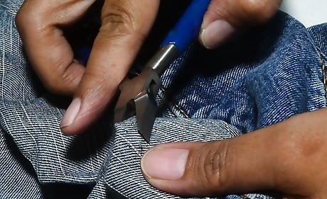 Turn the jacket inside out and bend the prongs down with a butter knife. Press down on the prongs with the knife until they are completely flat against the inside fabric. The stud should now be securely in place.