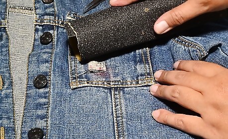 Repeat the process if you want the jacket to look more distressed. Try applying more pressure to the sand paper to help fray the fabric more.