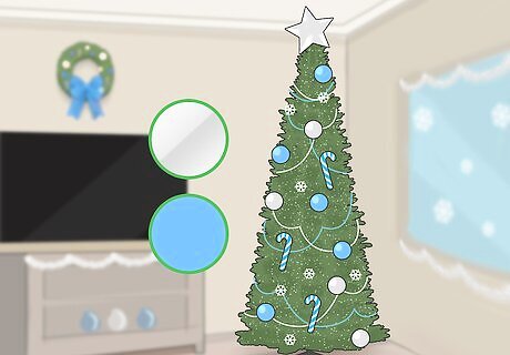 Create your own Christmas color scheme for a modern take. If bright red and green aren't your favorite colors or they simply clash with your existing decor, opt for your own Christmas colors. For instance, decorate your tree with silver and blue, and then add touches of those colors around the room, such as silver snowflakes, bowls of blue ornaments, and blue stockings. You could also do a twist on bright red and green, such as a burnt orange and sage green.