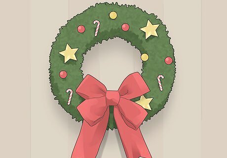 Put up a wreath on the wall for a traditional touch. Christmas is a perfect time for wreaths, and almost anything can be made into a wreath! Create a wreath out of evergreen branches accented with cranberries and white flowers to hang up, for instance. Alternatively, wrap red ribbon around a foam craft wreath for a quick pop of color. Get creative! Paint or decorate any round object in a Christmas style, such as a wagon wheel, a bicycle tire, a picture frame, or even the bottom of a bundt pan!