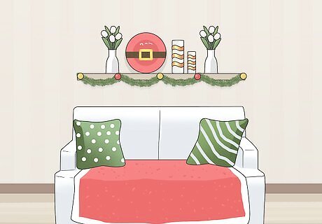 Group odds and ends in greens and reds for a traditional color scheme. While your color scheme doesn't necessarily need to be red and green, an easy way to create a "Christmas" look is to follow this scheme. You can even use things other than Christmas decorations. Just find a variety of items in these colors and set up a display or group them in small bunches around the room. For instance, if you have a white couch in front of a bookcase, throw green and red pillows and blankets on the couch. On the bookcase, put out green and red items, such as candles, baskets, knickknacks, and decorative plates. Add a few touches that are purely Christmas, such as a small Santa Claus.